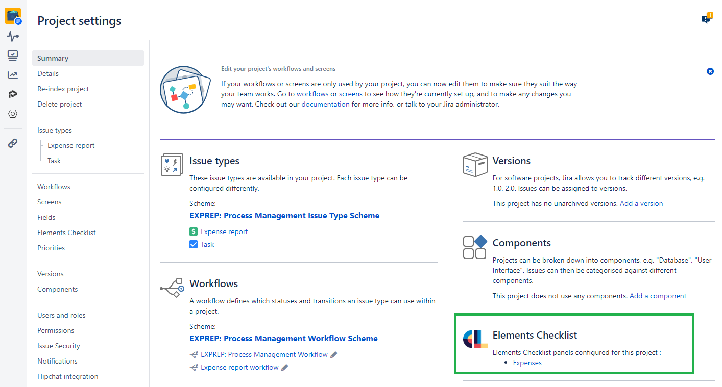 From the project settings section of a project, you can find a shortcut to the Elements Checklist configuration page for the project in the left sidebar: