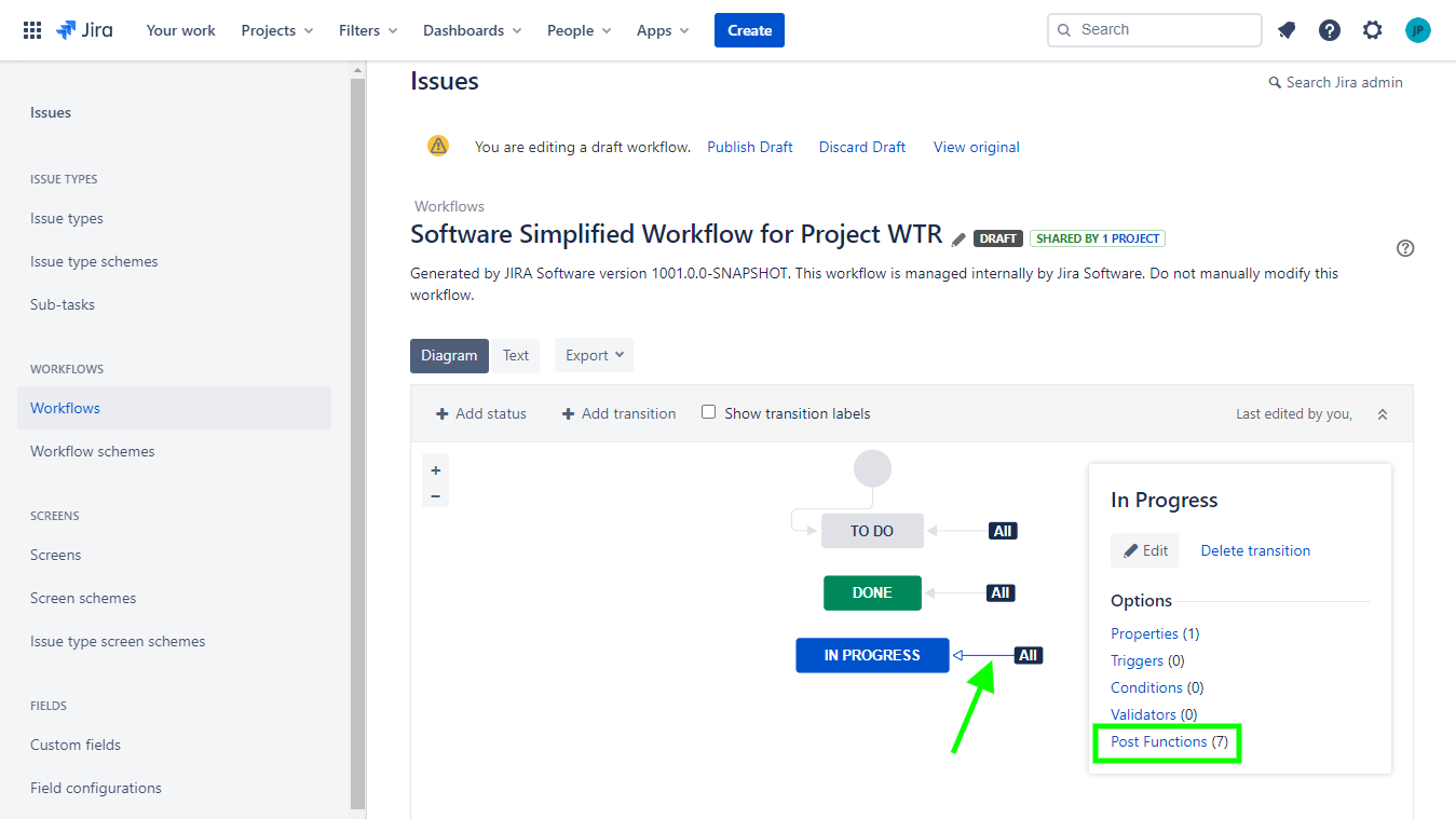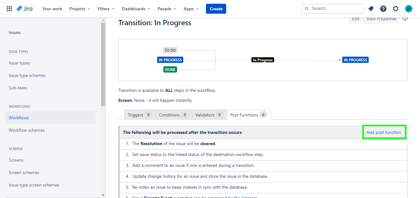 3 - In the diagram view, click on the "In Progress" transition. Then, click on Post-functions.