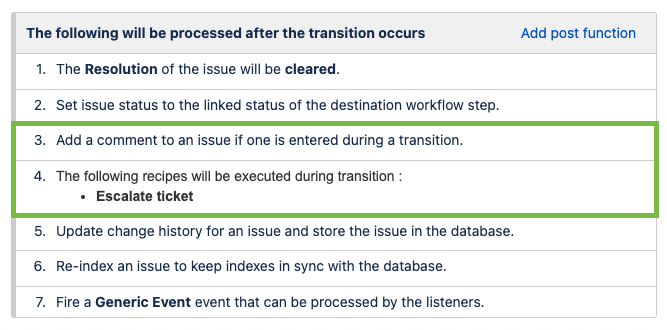 6 - Select the recipe "Escalate ticket" and add it to the post-function.