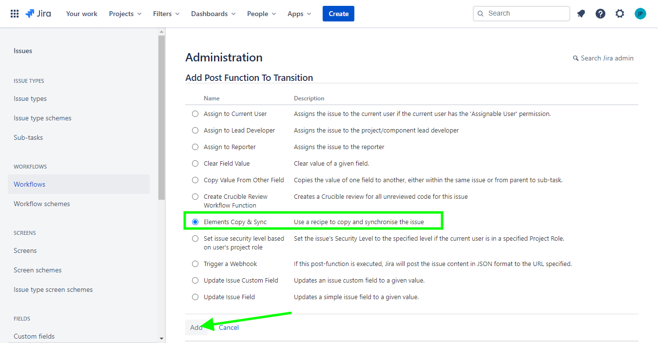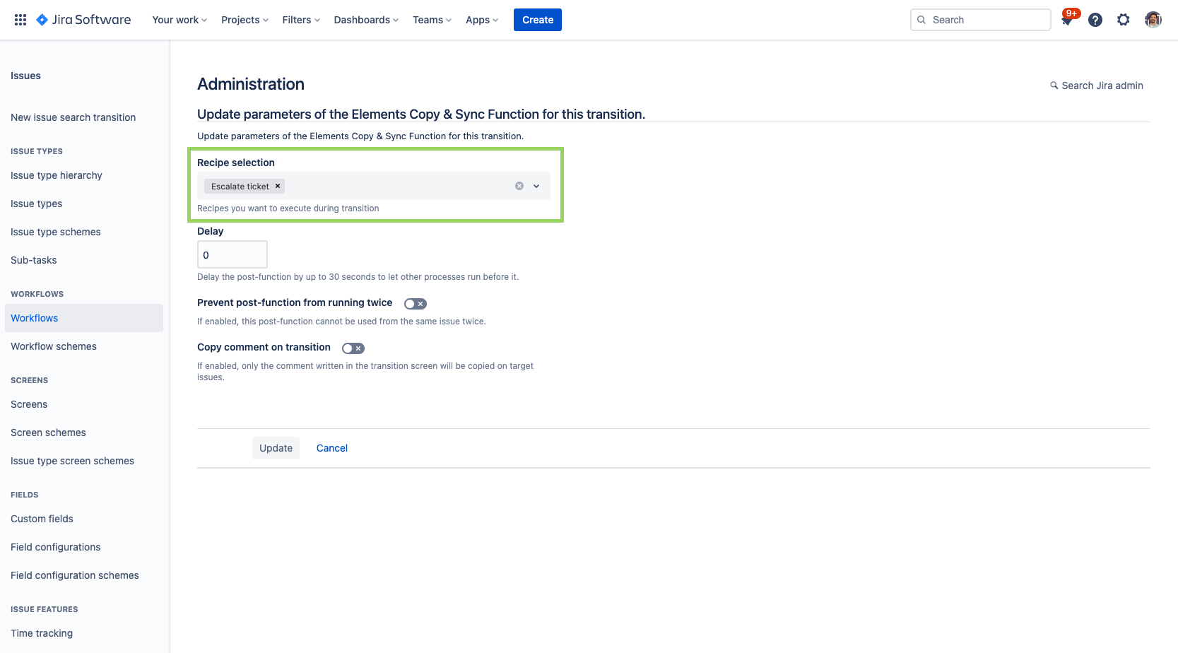 This guide explains how to configure a Copy & Sync post-function during a Jira workflow transition so that a copy recipe is automatically triggered when the status is updated.