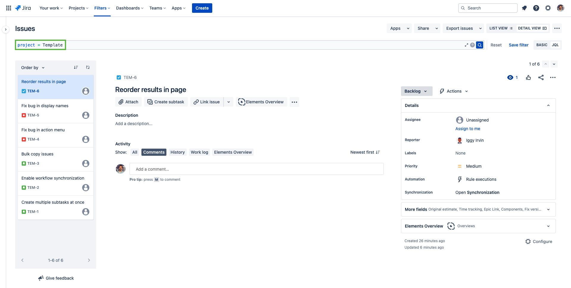 In this example, we are going to list all the issues from project "Template", because these are the ones we want to copy.