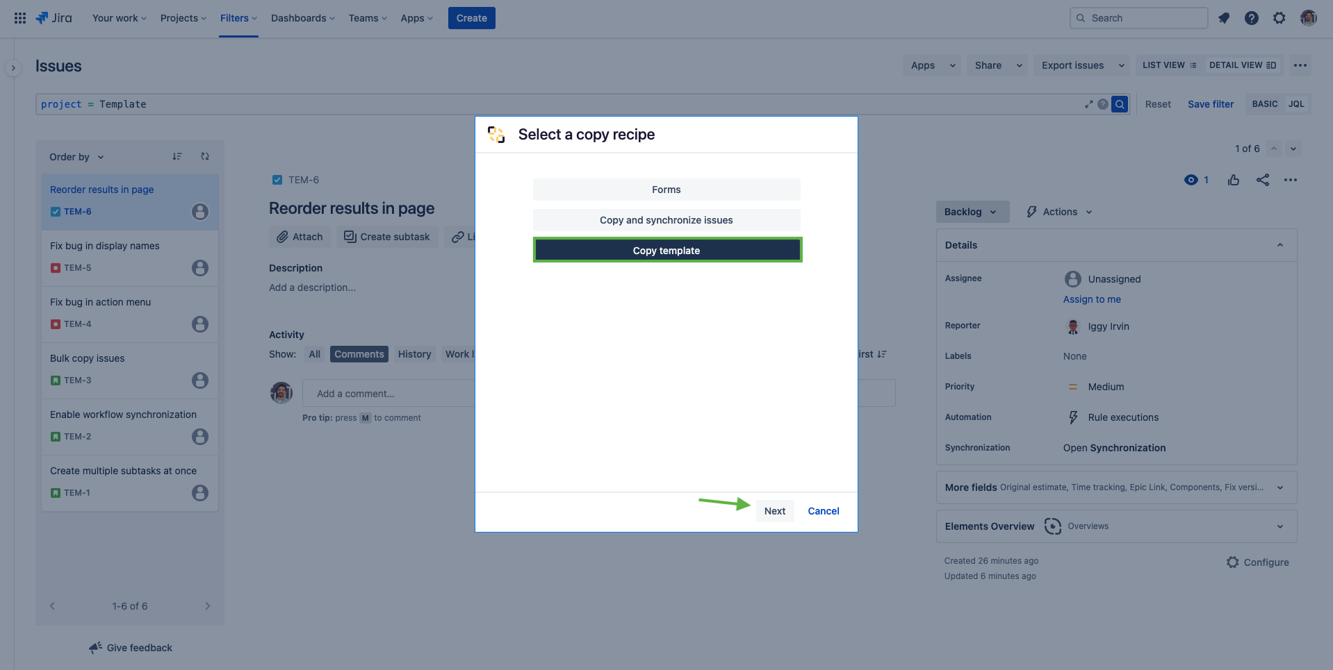 In this example, we are going to list all the issues from project "Template", because these are the ones we want to copy.