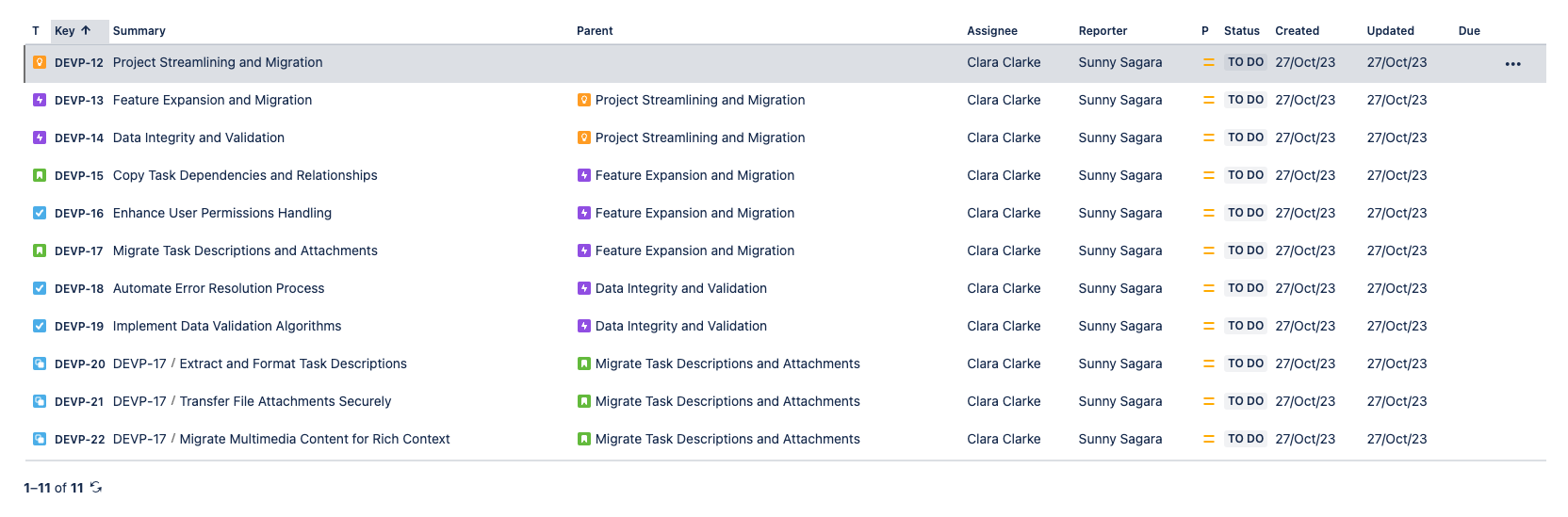In this example, we will copy an Initiative (with the key DEV-1) which contains two Epics, some tasks, stories and subtasks (see the image below).
