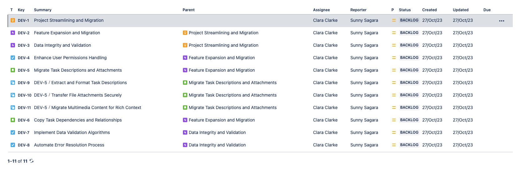 In this example, we will copy an Initiative (with the key DEV-1) which contains two Epics, some tasks, stories and subtasks (see the image below).