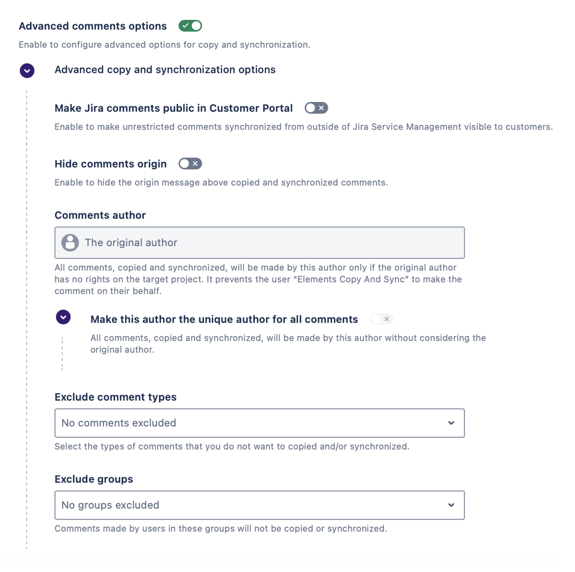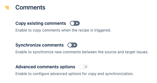 This section lets you configure how comments are copied and synchronized between the source issue and its copies.