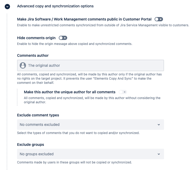 If the author of the original comment has the rights to post comments in JSM, they will be used as the author of the synchronized comment. Otherwise, the author of the synchronized comment will be "Elements Copy And Sync", and the original author will be displayed at the top of the synchronized comment. You can also change this behavior using "Comments author" option in the Advanced comments options below.
