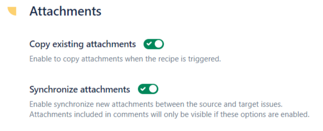 If this option is enabled, when a recipe is triggered from the source issue, all attachments under 50MB are copied to the target issue.