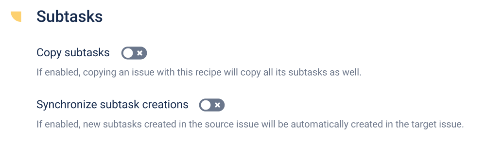 If this option is enabled, the subtasks of the source (or the entire hierarchy) issue will be duplicated as subtasks to the target issue when the recipe is triggered. The fields and the attachments of each subtask will be copied in the process.
