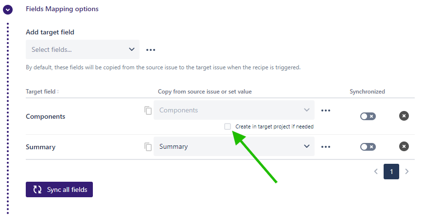 Use this option to select which fields must be set in the target issue by the recipe.