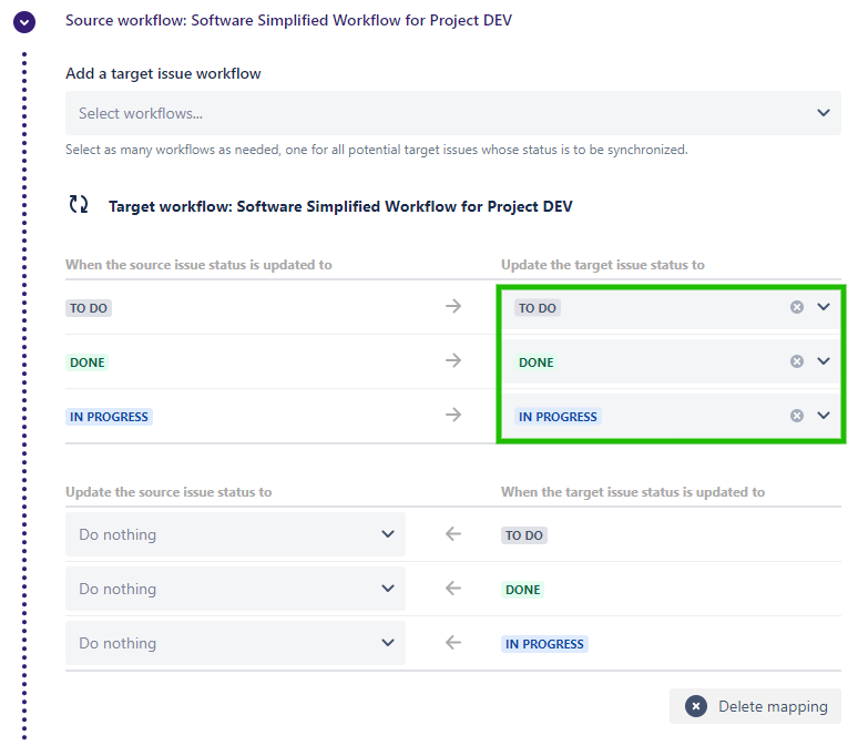 6 - Use the workflows mapping table to match the statuses between the source and target issue.