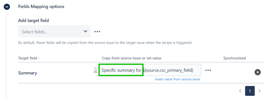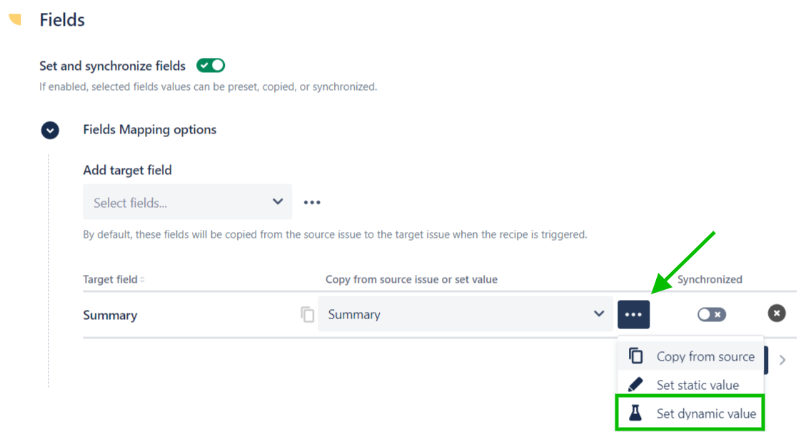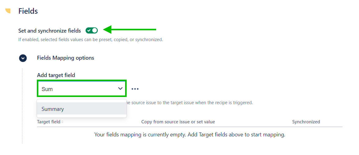7 - Enable the Set and synchronize fields option, then select "Summary" in the Add target field option.