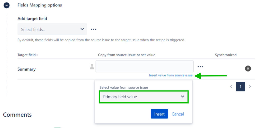 10 - Use the Insert value from source issue option to open a pop-up, then select Primary field value.
