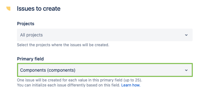 In our example, we will use the "Components" field. This means that the recipe will create one issue for each component in the source issue (in our case, there are three components, so three issues will be created).