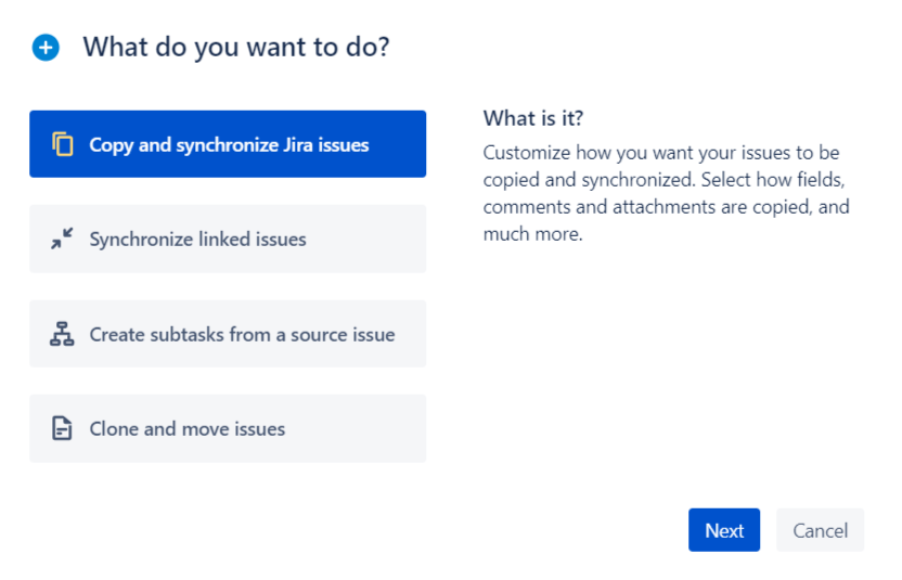 2 - In the dialog, select Copy and synchronize Jira issues and click on the "Next" button.