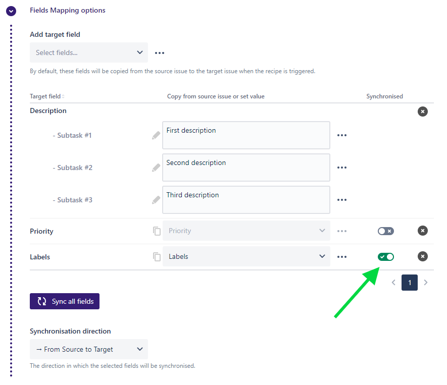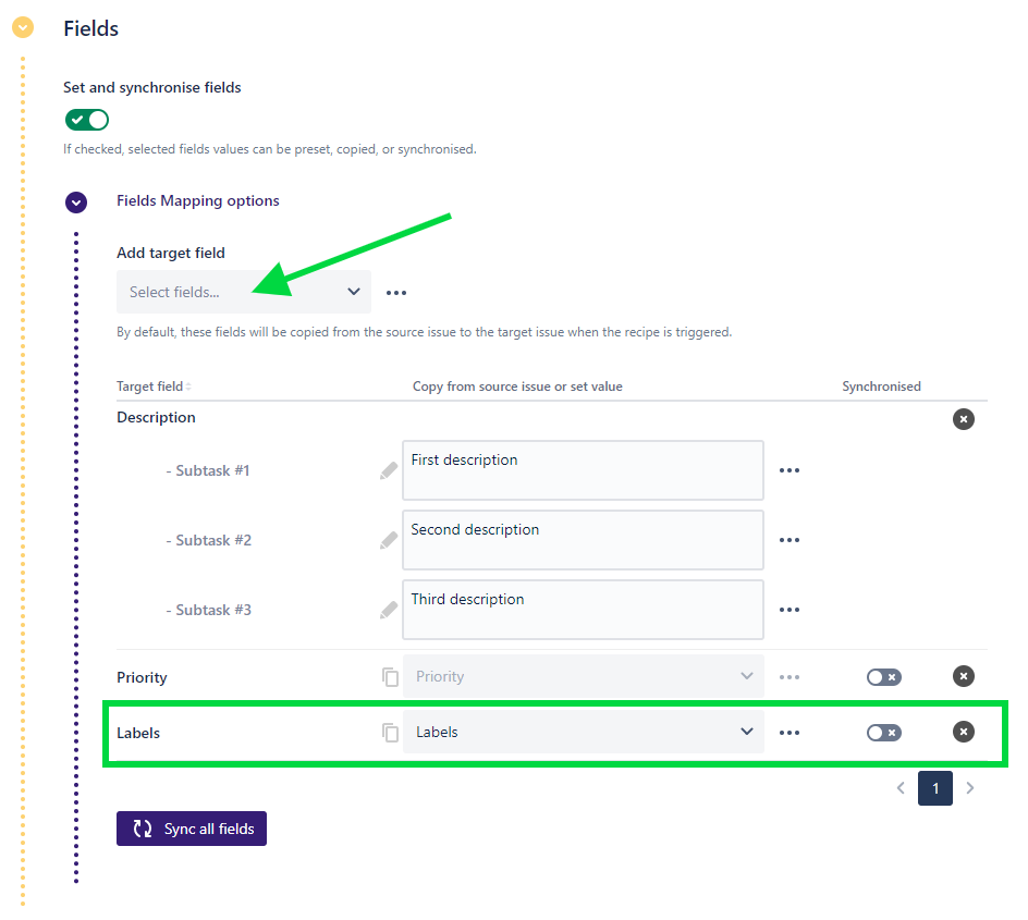 By default, the value of the "Labels" field will be synchronized from the parent issue to the subtasks. You can use the Synchronization direction below the table to the direction that suits your needs.