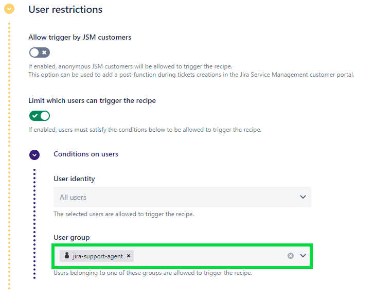 5 - The "Conditions on users" subsection is open. Use the User group option to select the group that will be allowed to trigger the recipe, in our example "jira-support-agent".