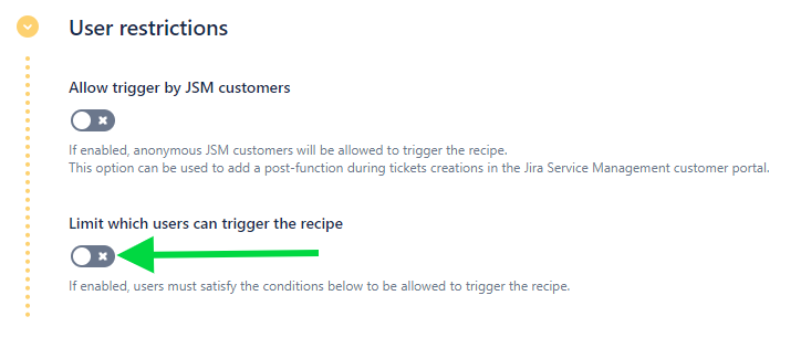 4 - In the "User restrictions" section, activate the Limit which users can trigger the recipe toggle button.
