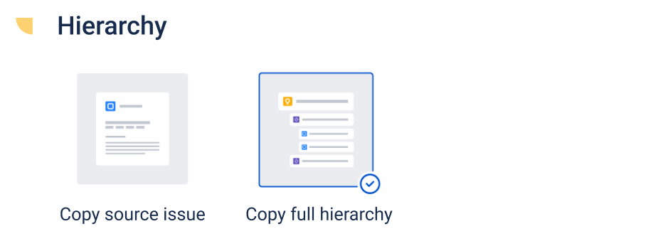 Choose if you want to copy only the source issue or the entire hierarchy tree. If you select "Copy full hierarchy", for example, if your source issue is an Initiative, it will copy all the issues of the hierarchy (except the subtasks that you will need to select in the Content section).