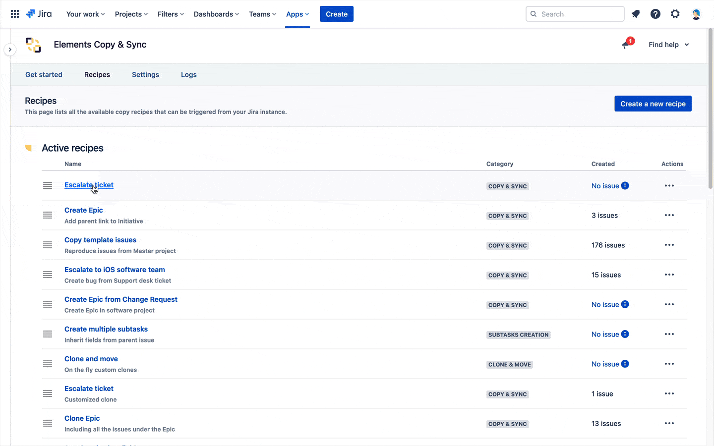 1 - As a Jira administrator, go to the "Elements Copy & Sync Cloud" administration and click on Recipes in the navigation bar.