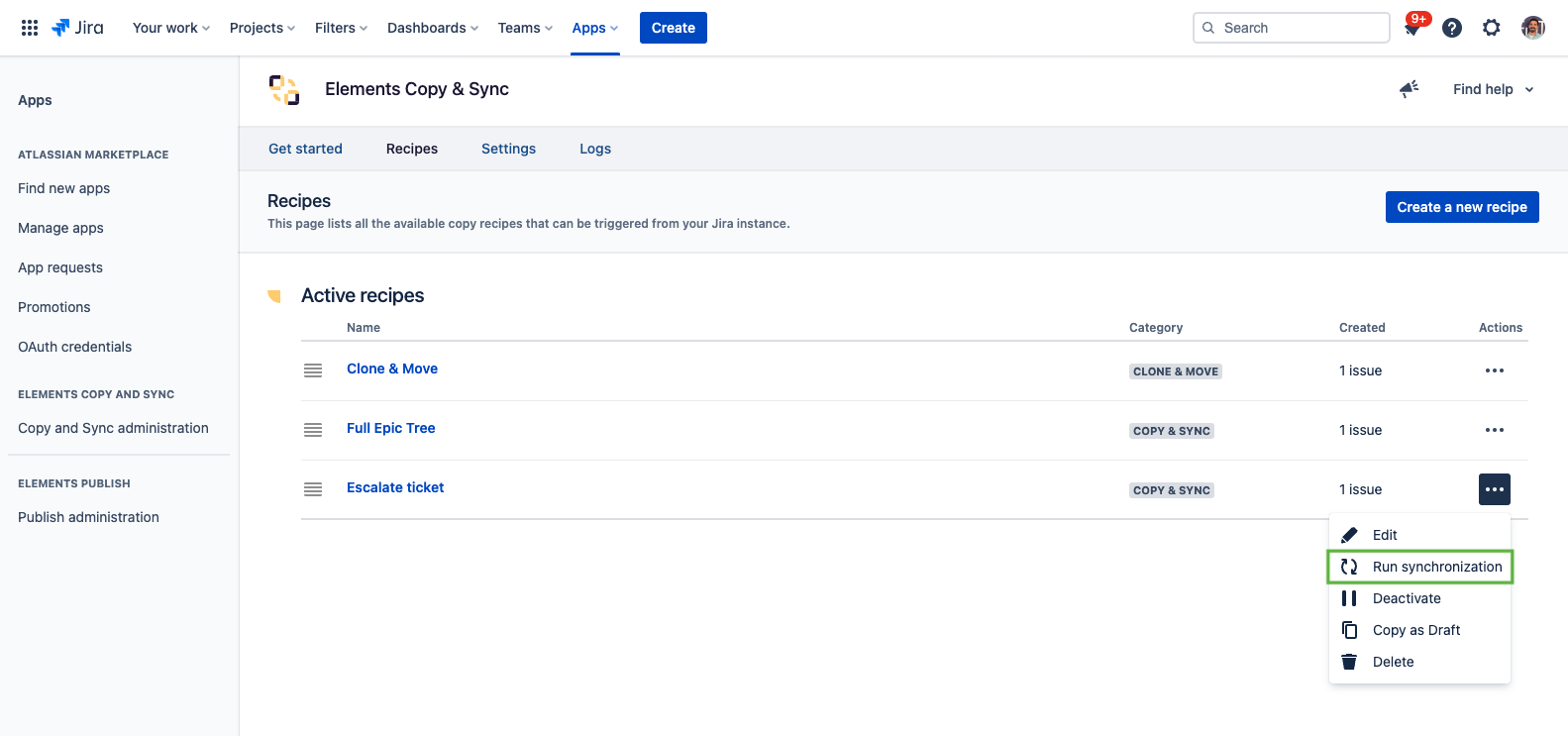 1 - As a Jira administrator, go to the "Elements Copy & Sync Cloud" administration and click on Recipes in the navigation bar.