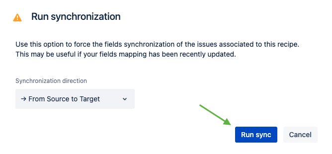 7 - You now have to choose the synchronization direction to force the fields synchronization of the issues associated to the recipe. Then, you click on "Run sync" to launch the synchronization.