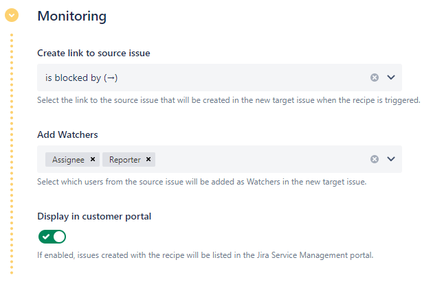 This section lets you configure how the created issue can be monitored by the user who triggers the recipe.