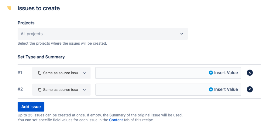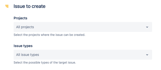 If only one project and one issue type are selected in this section, the execution of the recipe will be shorter. Indeed, the end-user will not have to decide manually which project and issue type to target when triggering the recipe, and the issue creation dialog will be opened immediately.