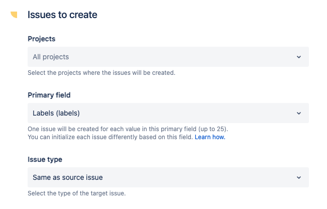 This section lets you configure how many issues will be created from your source issue.