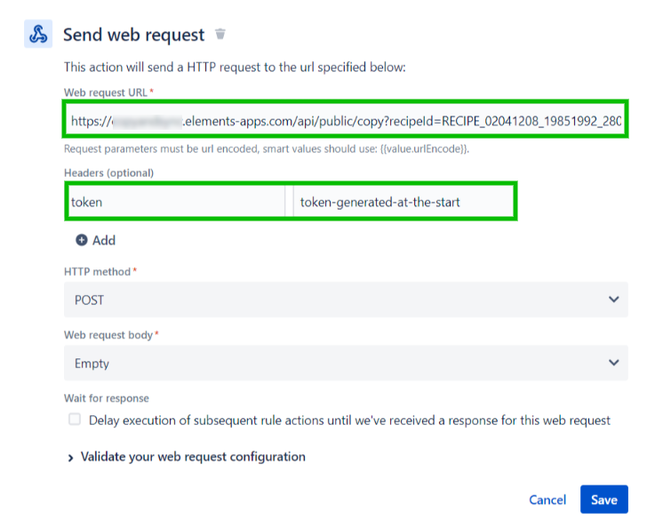 Note: at the end of the Request URL, the placeholder {{issue.key}} means that the current issue will be copied by the recipe. This placeholder can be replaced by any issue key if you wish to copy a specific issue.