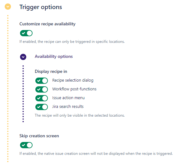 By default, recipes can be activated manually through the action menu of an issue, or added as a post-function in a workflow transition. If this option is enabled, the "Availability options" can be set to change this default behavior to a custom one.