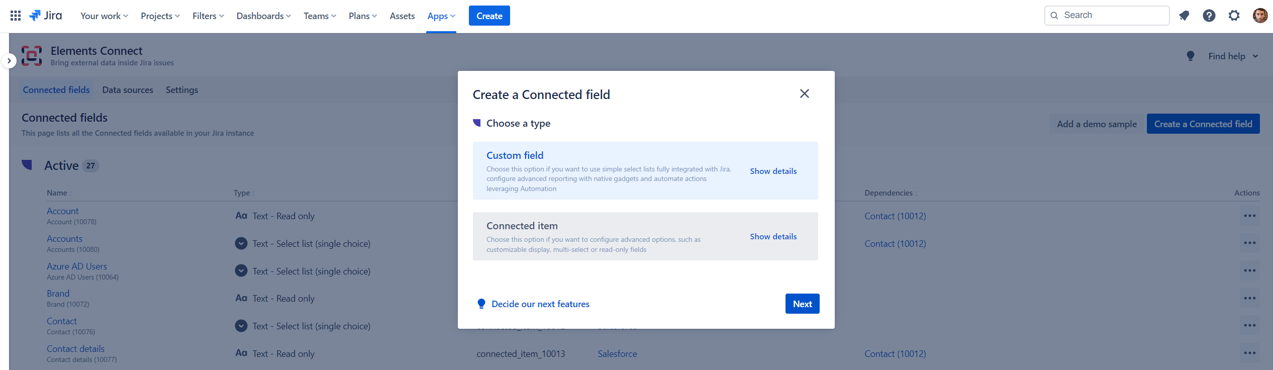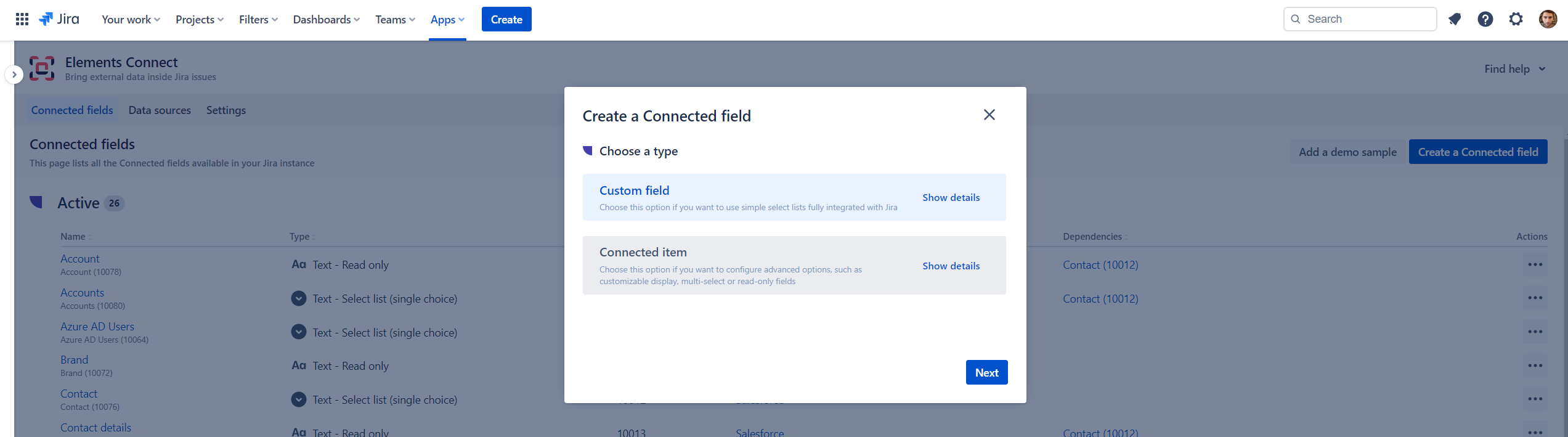 An Elements Custom field is a connected select list retrieving data from configured external data sources.