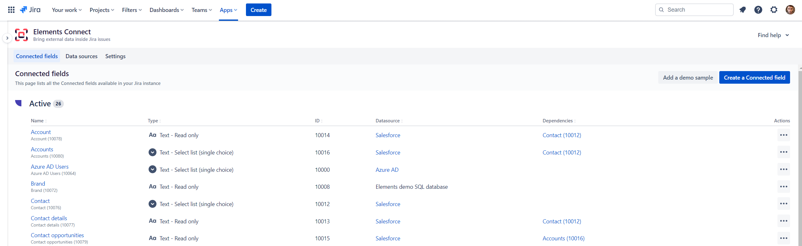 Once the data source is configured, go to the Connected fields tab where all of the previously created connected fields are shown: