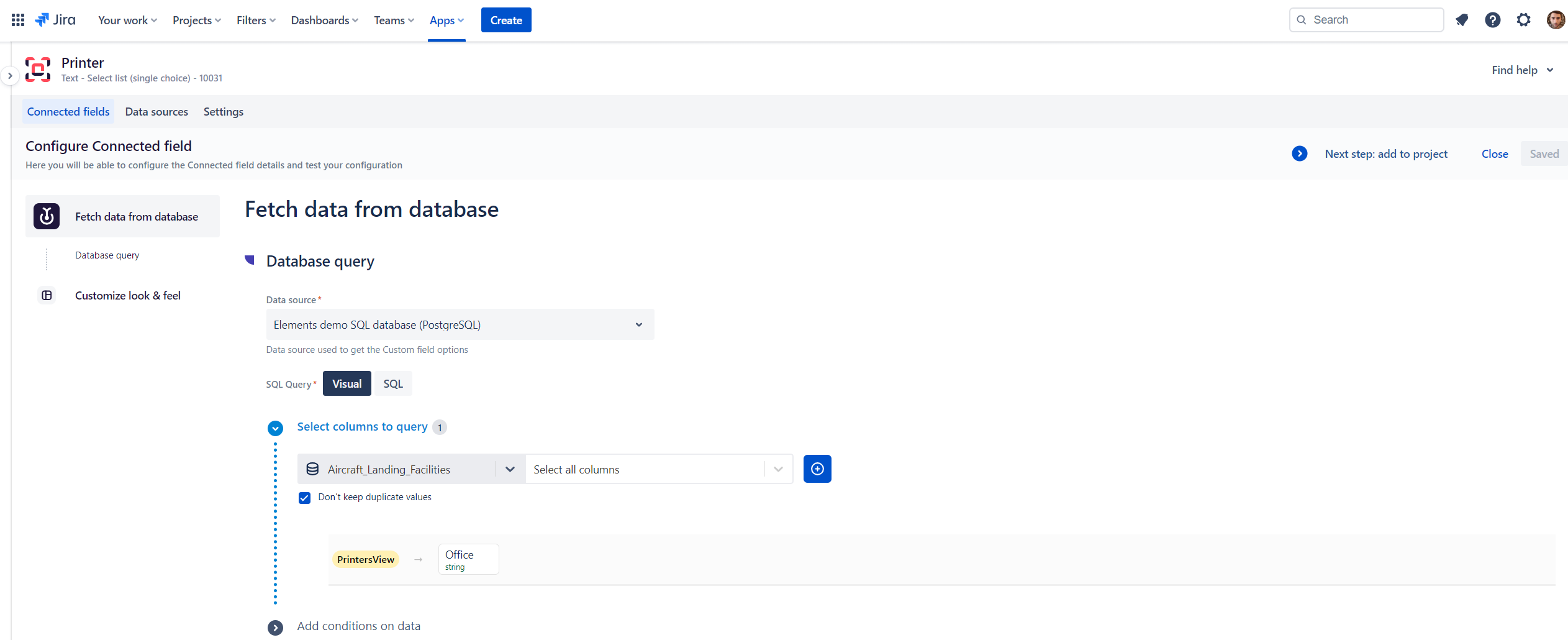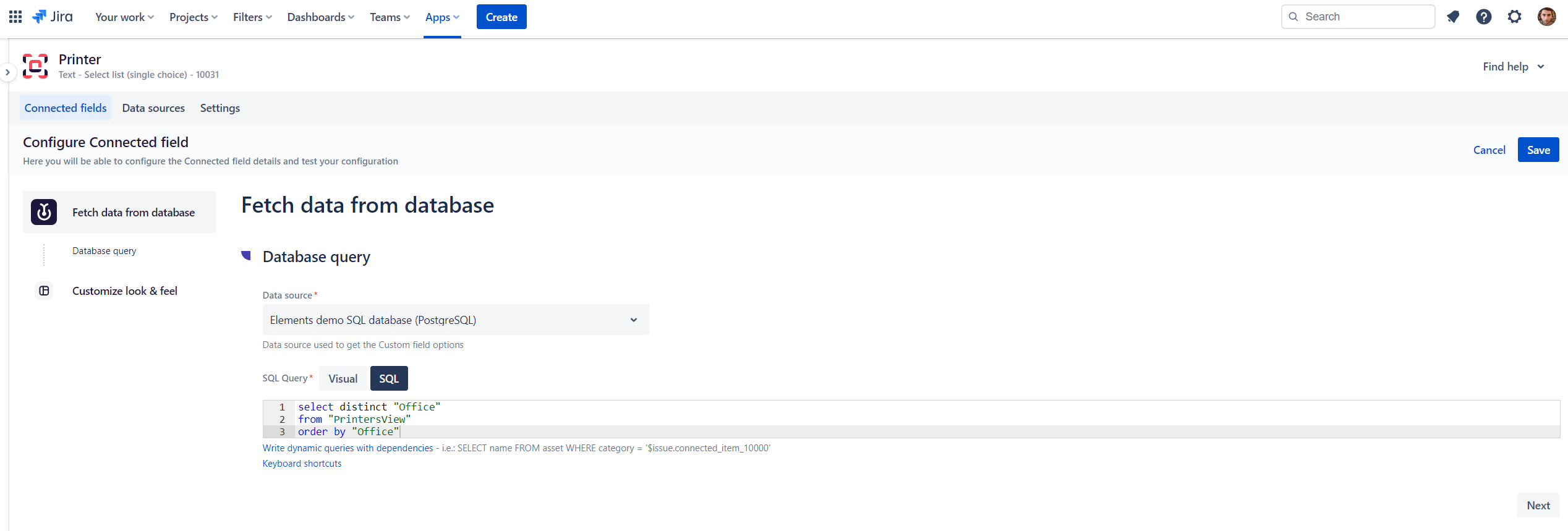 In Custom field configuration page, you can either configure your query manually, or use our visual tool to navigate among your data source structure and create your query more easily.