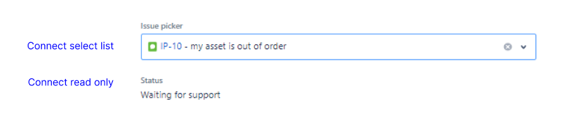 Issue status - to display the status based on the key of the issue selected in the "Issue picker" Connected item