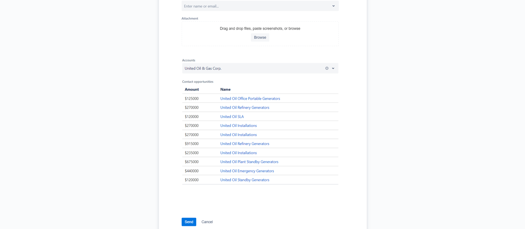 Contact opportunities: A read-only that displays dynamically every opportunities Amount and Name from the previously selected Account