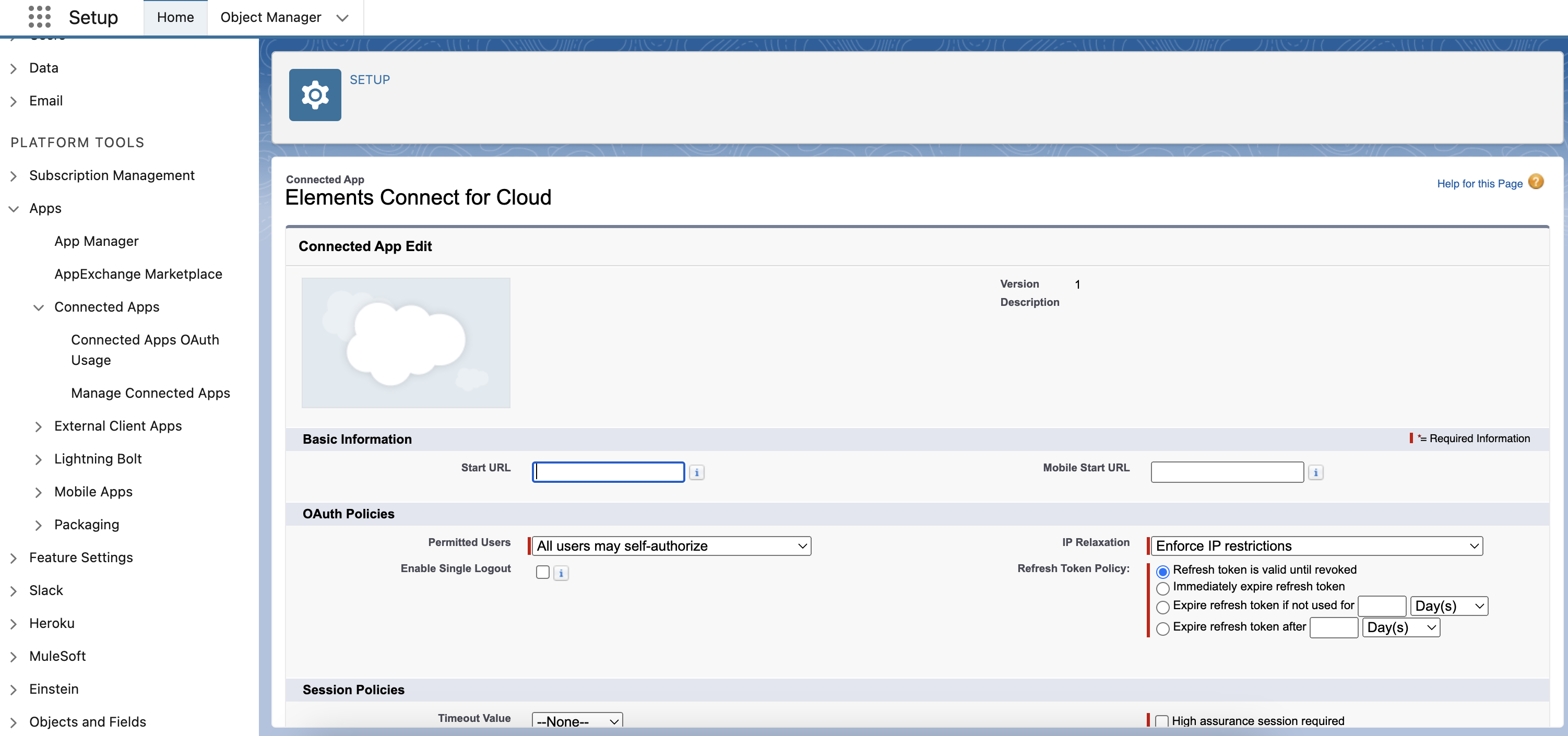 Specifically, if the “Full access (full)” scope is not included in the Salesforce app, the “full” scope should not be added in Elements Connect either.