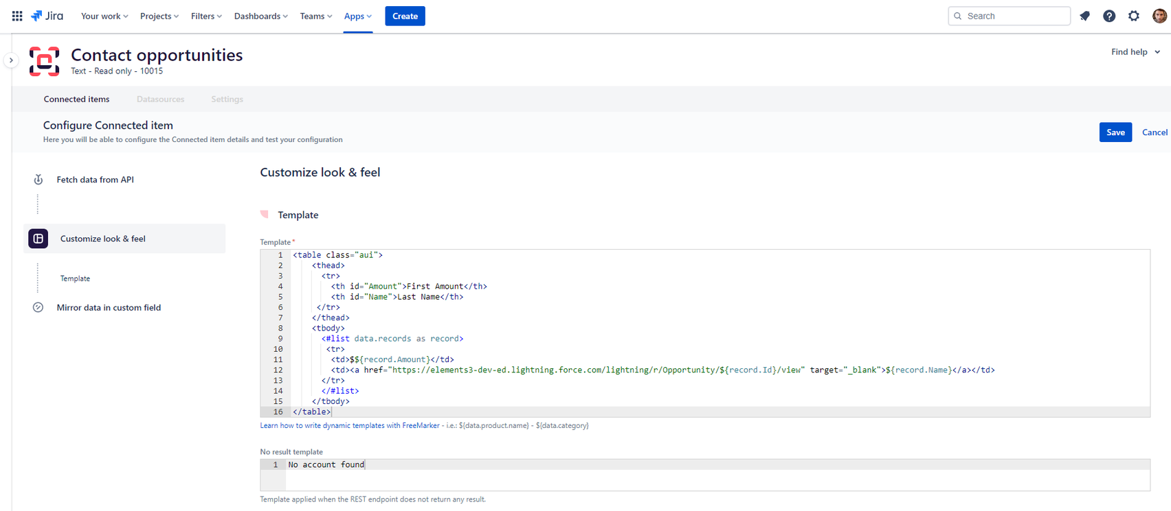 We want to display dynamically every opportunities for a given account in a table. As freemarker handles and interpret HTML, you can configure the template as the following: