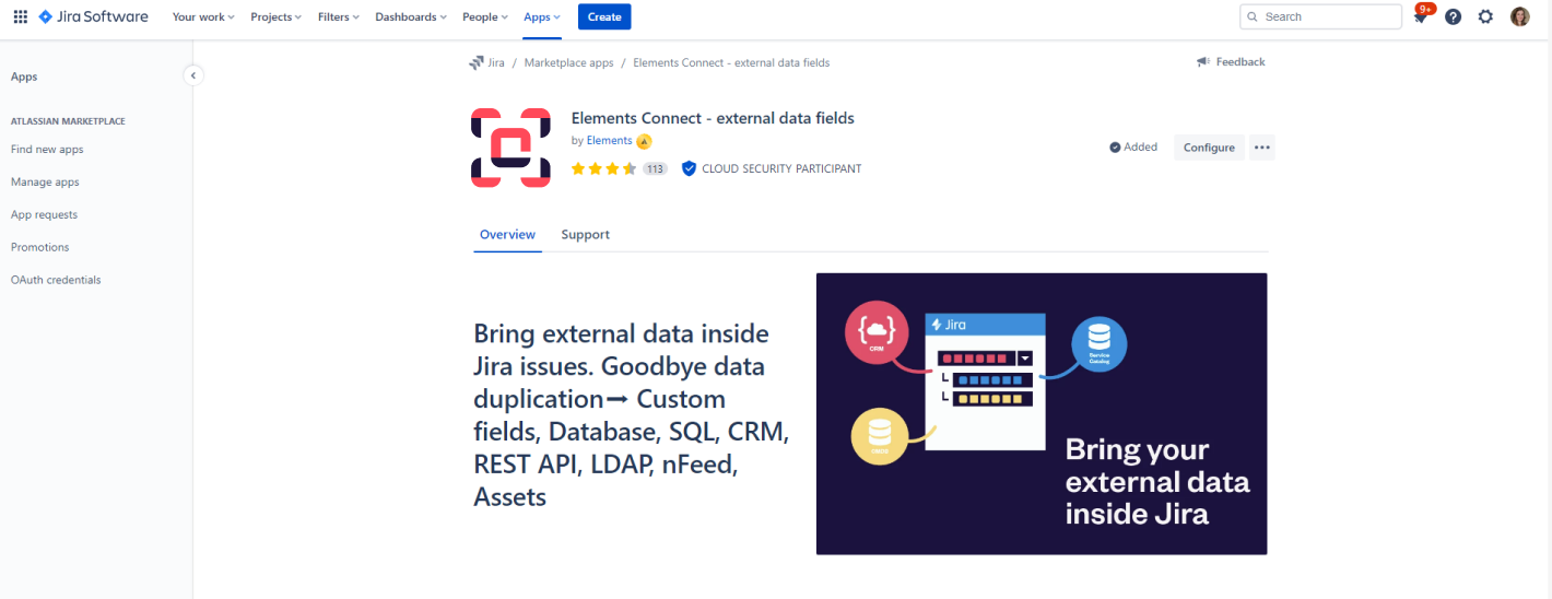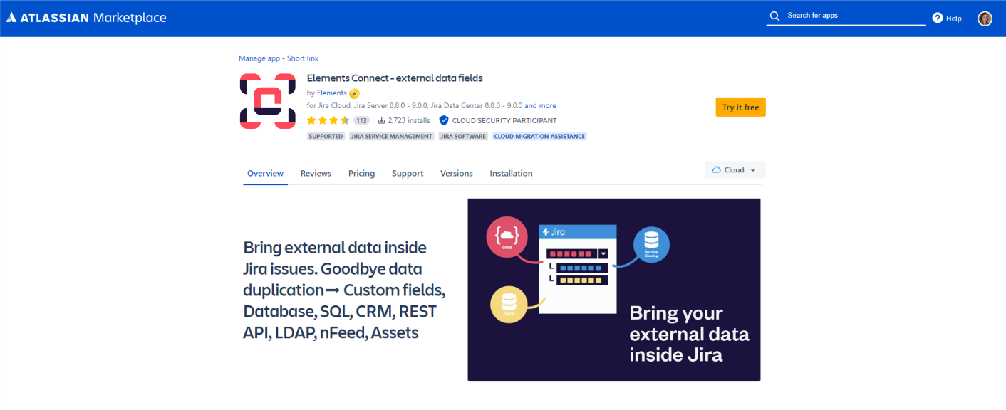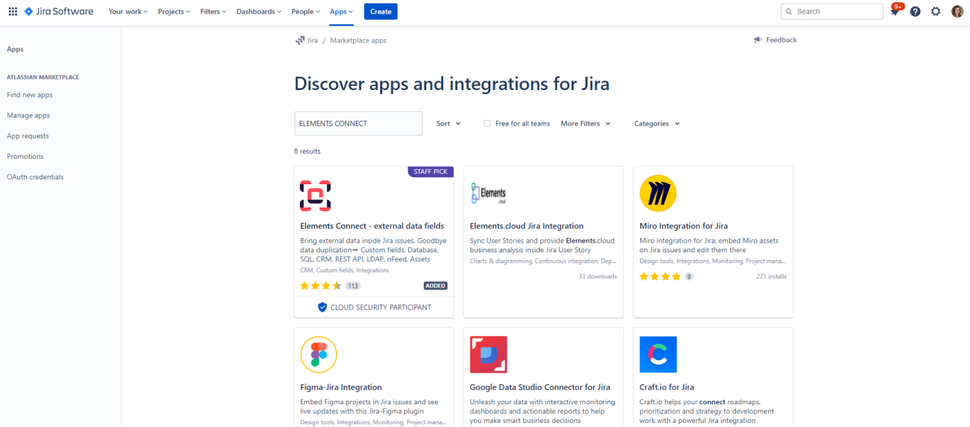 Elements Connect for Jira Cloud can be installed from the Atlassian Marketplace or directly from a Jira instance.