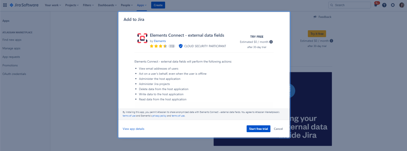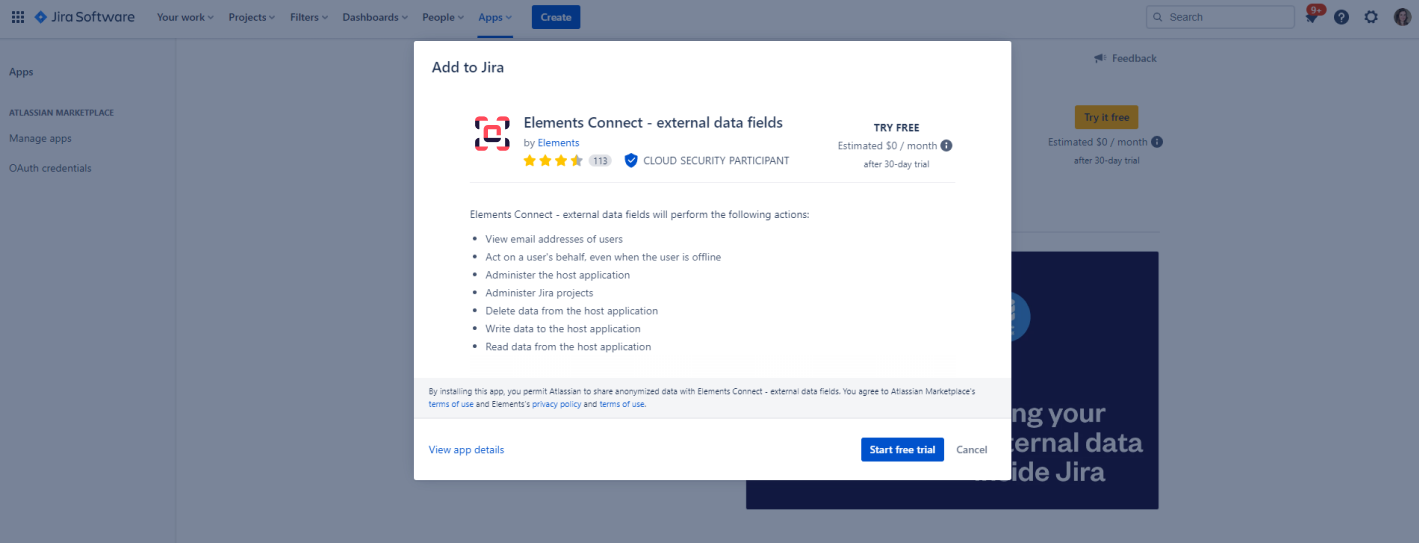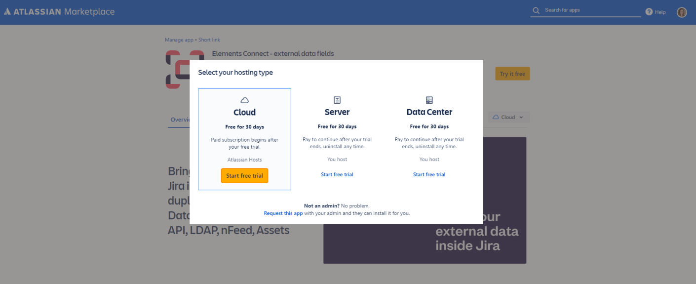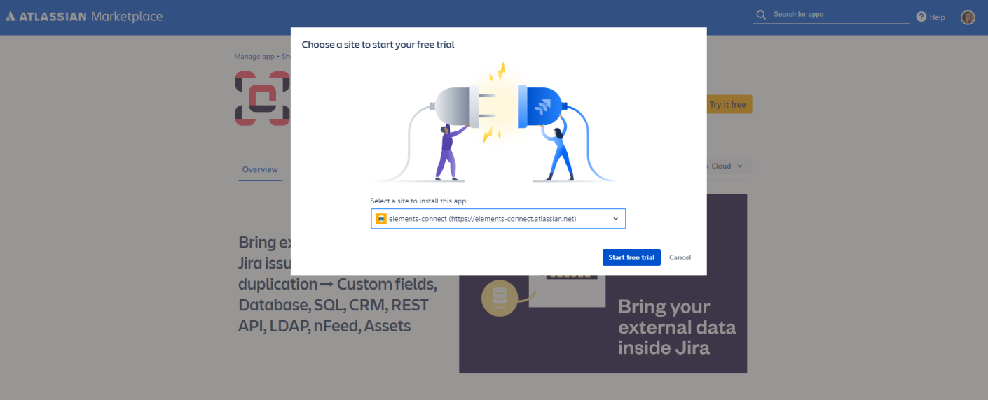On the next screen, select the Jira instance where you want to install Elements Connect for Jira Cloud and click on "Start free trial"