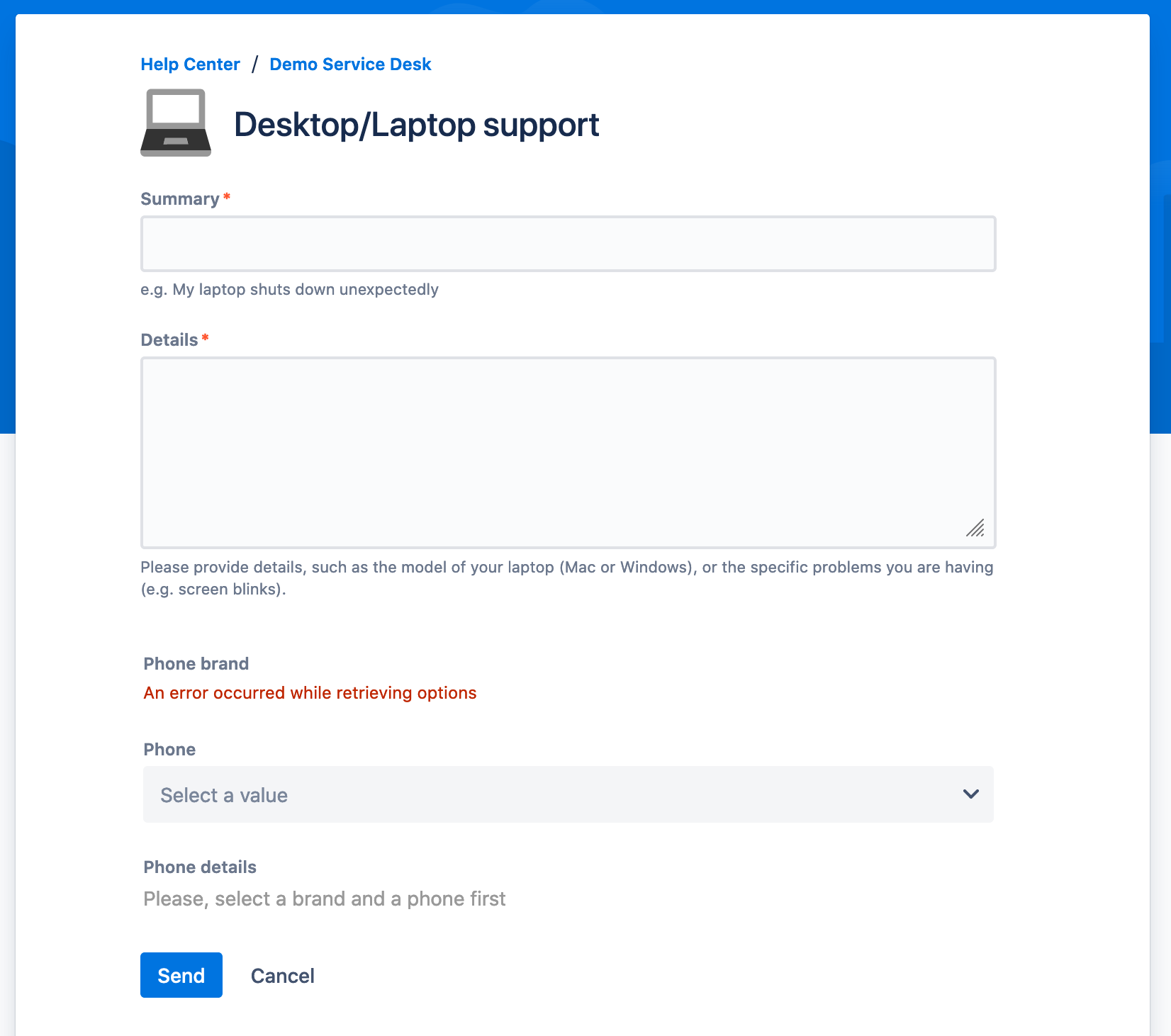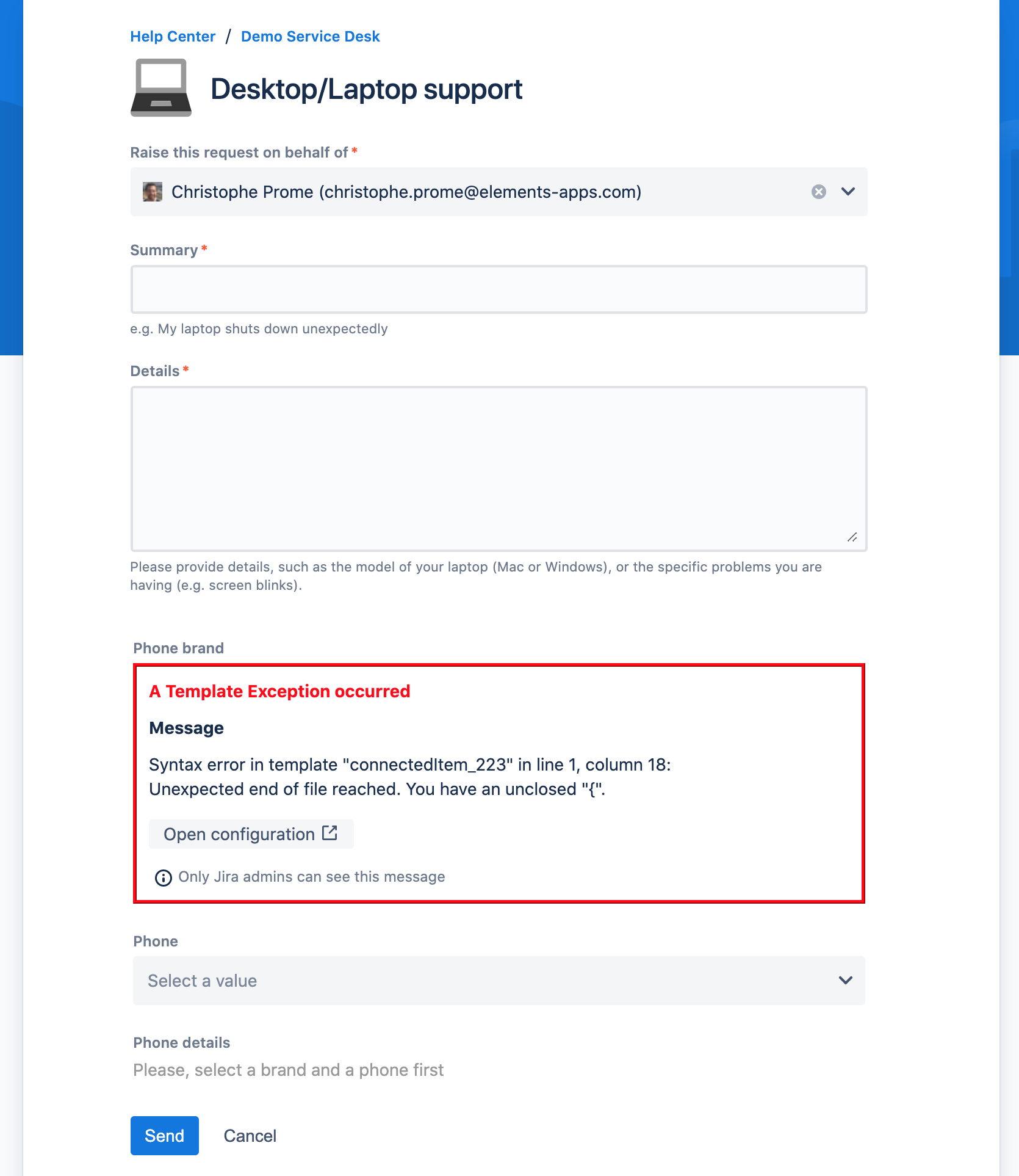 To debug an invalid configuration, Elements Connect displays an informative error message in the Jira Service Management portal view: