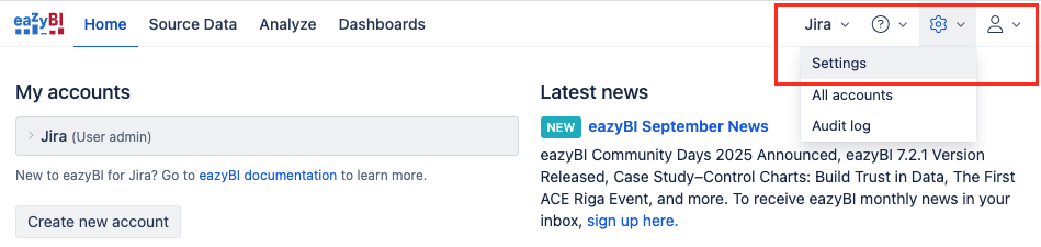 In EazyBI application, go to your settings: