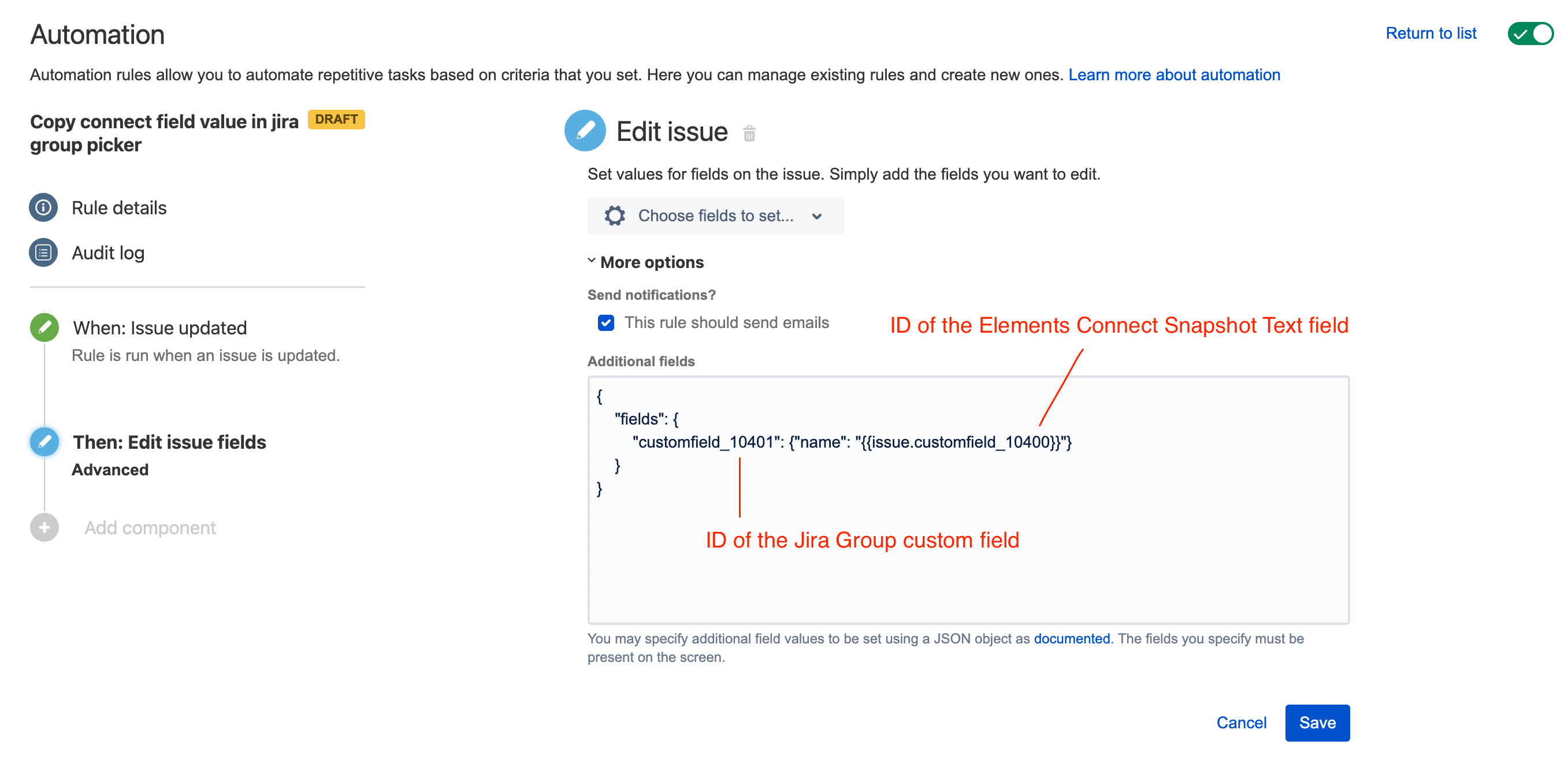 Add the previously created Group Picker field to your project and make sure that the rule runs correctly.