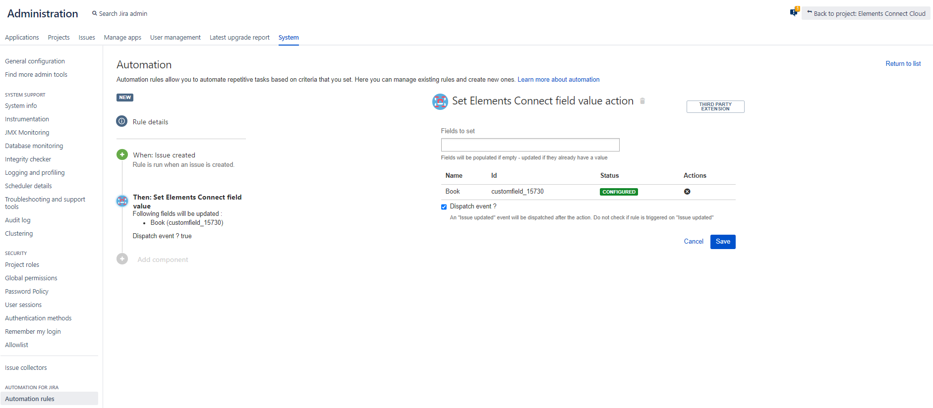 Automation for Jira - Elements Connect action: to set the value of an Elements Connect field with an Automation for Jira action