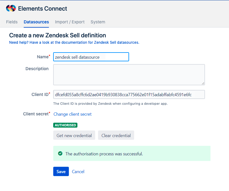 Specify the Client ID and Client Secret. Here you should paste the credentials created previously in Zendesk Sell.