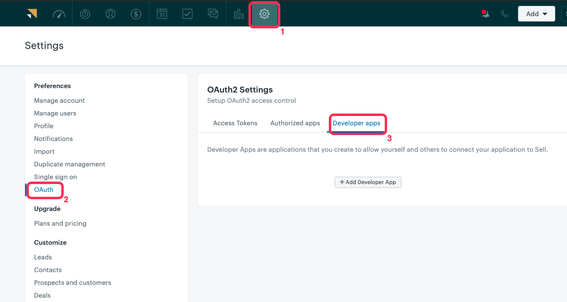 The first thing that you need is to setup an OAuth2 access to Zendesk Sell. From your Zendesk Sell dashboard, open the Settings. This item can be found in your user menu in the top section of your dashboard page. You need to have administrator permissions.