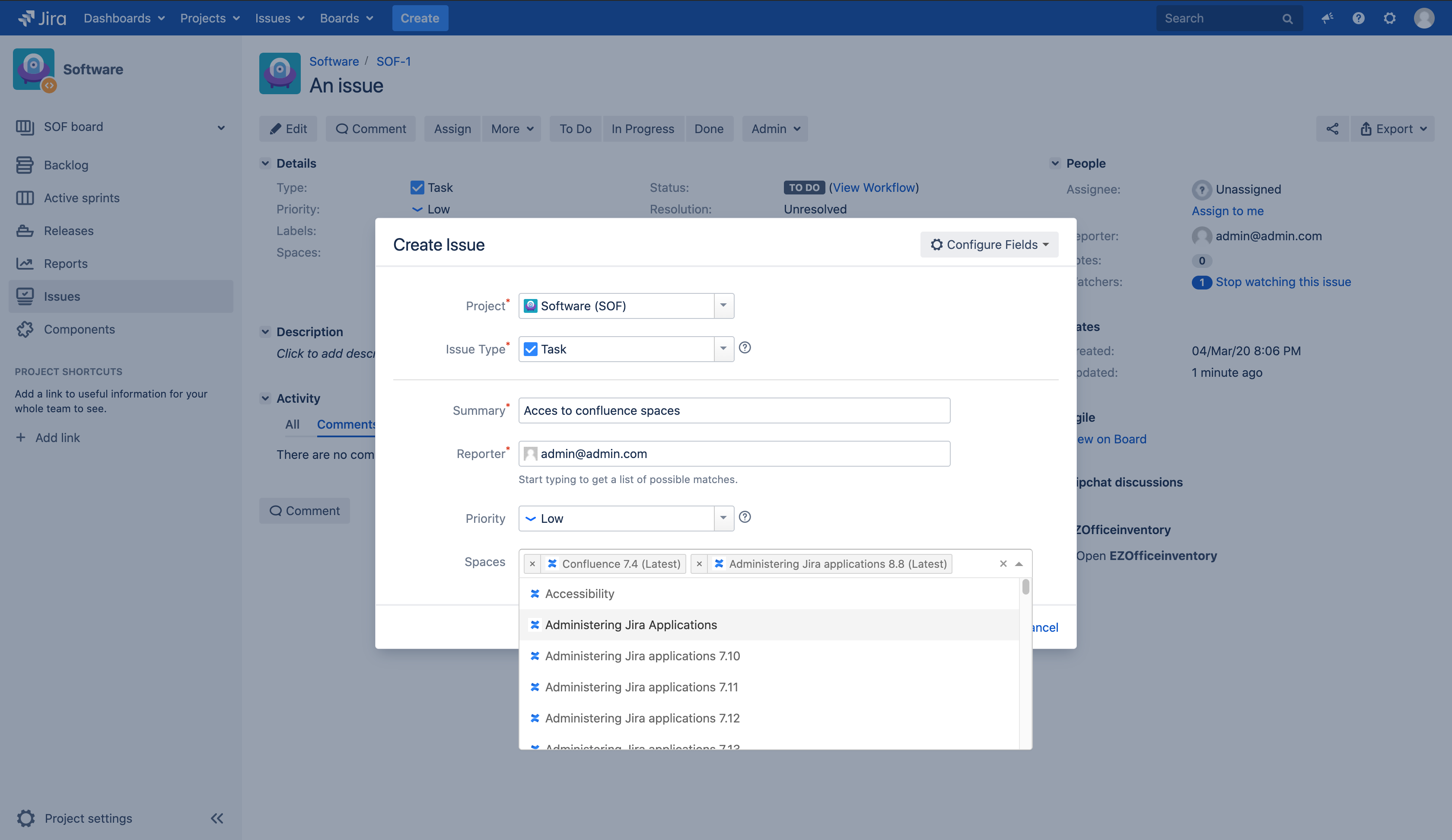 Connect Jira to Confluence and create a Space picker.
