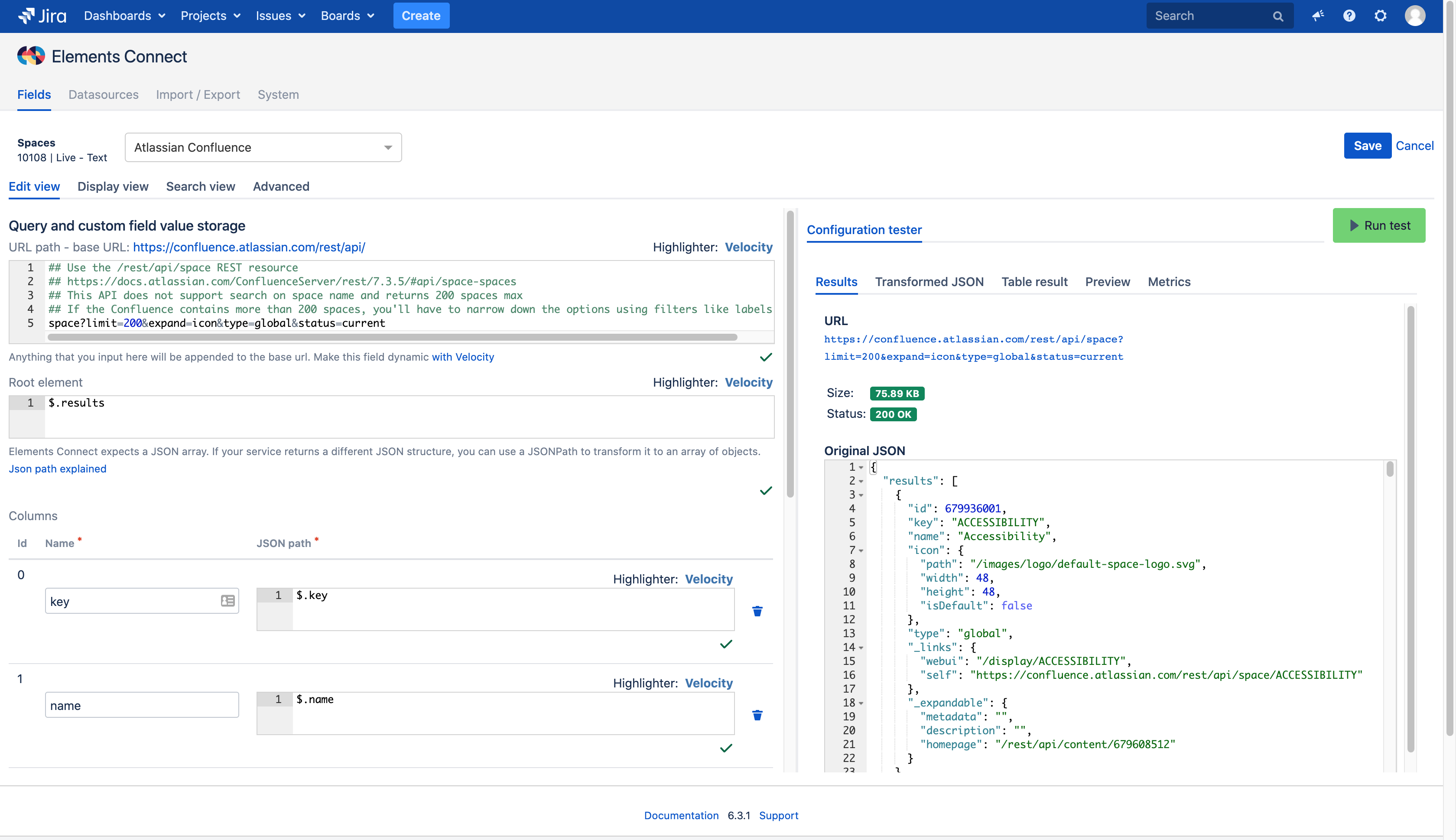 The field is now configured. You can adapt the query ("URL Path") to your needs, check out the Confluence REST API documentation to discover what you can do with it.Click the "Save" button, the field can now be used from an issue.