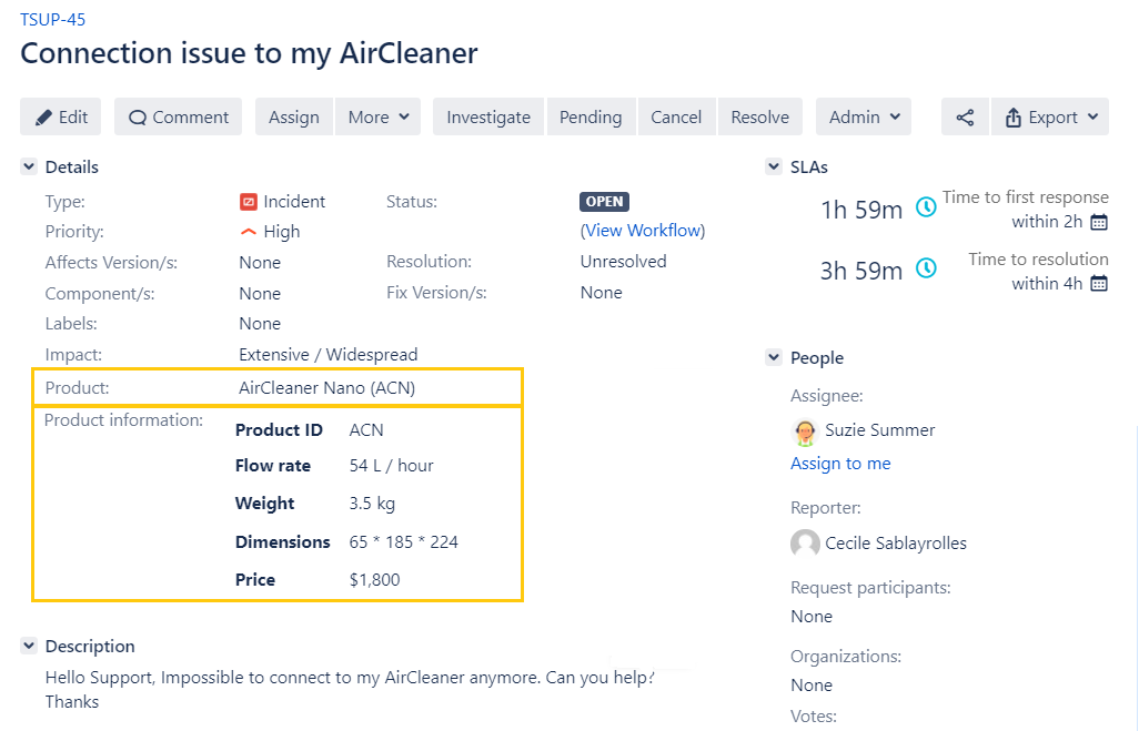 On the user side, once a incident is noticed on a product, they open a new ticket on Jira: in this ticket, they can select easily the product impacted from the select list populated by Elements Connect with all Product names. The dependent read-only field will display all technical details on the selected product.