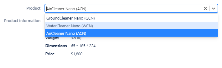 for final users, to be guided through the creation of Jira issues linked to specific products by being able to choose directly in the issue the associated product from a drop-down select list. Also, once the product is selected, additional information on it should be displayed in the issue.