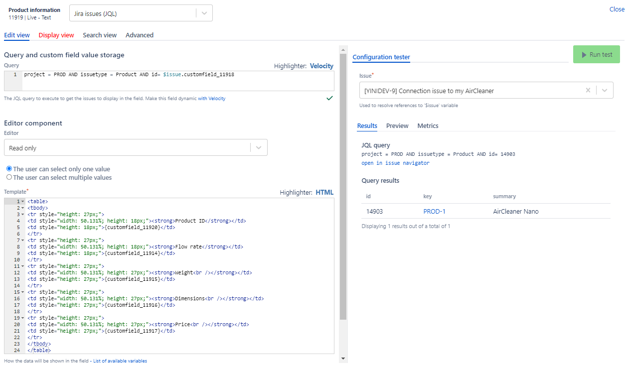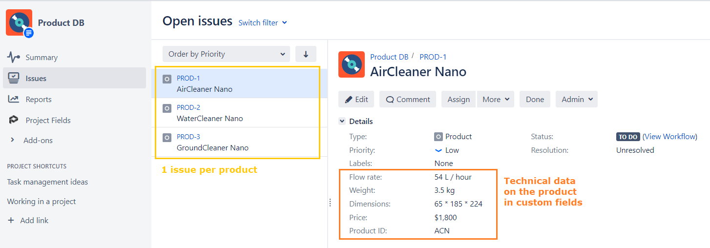 In this project, one issue per product is created and filled with data on this product in custom fields (weight, dimensions, price, etc):
